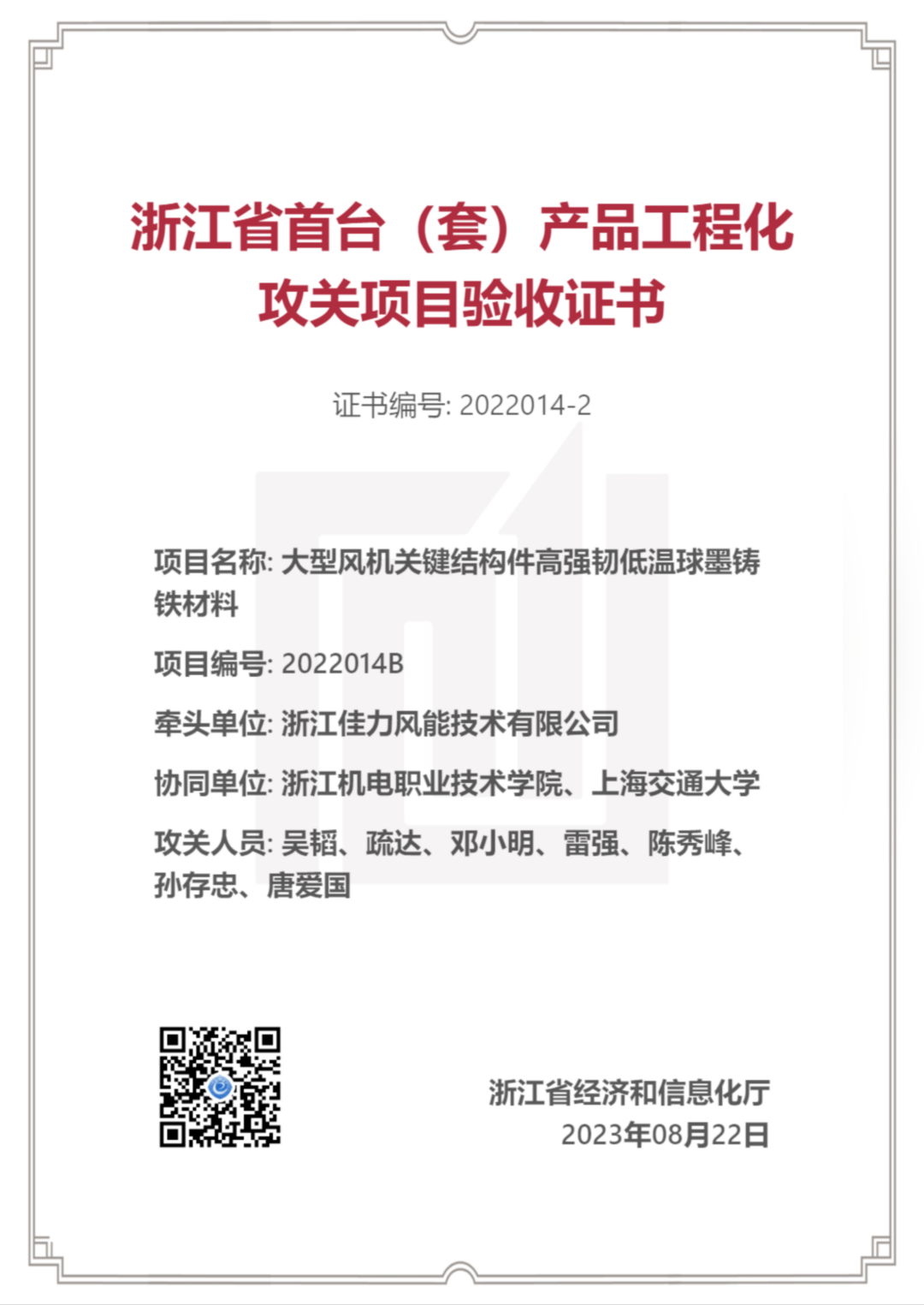 近日,由学校增材制造学院吴韬老师主持的2022年度浙江省制造业首台(套)产品工程化重点攻关项目“大型风机关键结构件高强韧低温球墨铸铁材料(项目编号:2022014B)”顺利通过省经信厅验收。今年7月,省经信厅公布的2023年度浙江省首台(套)产品工程化攻关项目中,学校作为核心协作单位参与“自由曲面光学元件加工机器人装备”研发。这些重量级科研项目和成果的取得,是近年来学校推动科研工作改革创新,不断推出创新体制机制、孵化科研团队、培育核心竞争力等一系列科研重大改革举措获得的重大成效,标志着学校科研核心竞争力得到长足发展,服务国家高端装备重大战略能力再上新台阶。