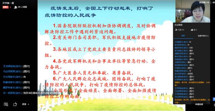 这是一堂有政治高度、有情感温度、有理论深度的网络思政课,让远在千里之外的学子们在网络课堂上不仅感受了网络课堂的魅力,也经受了一次深刻的心灵洗礼,接受了一次深刻的爱国主义思想教育。同学们纷纷留言,互动讨论,一致认为,病毒虽然无情,但阻挡不了人间真情,阻挡不了学子对知识的追求,透过屏幕,他们感受了不一样的课堂和不一样的情怀。学生们还表达了对湖北武汉疫区人民的关切,对强大祖国战胜疫情充满信心,对伟大民族精神感到自豪。有的同学表示,如有需要,随时奔赴抗击一线充当志愿者为疫情防控出一把力。在疫情防控的关键时刻,这堂思政课又显得分外温馨,给了学生们以特有的温暖和战胜疫情的信心,更加坚定了同学们为中华民族伟大复兴而奋斗的信念。
