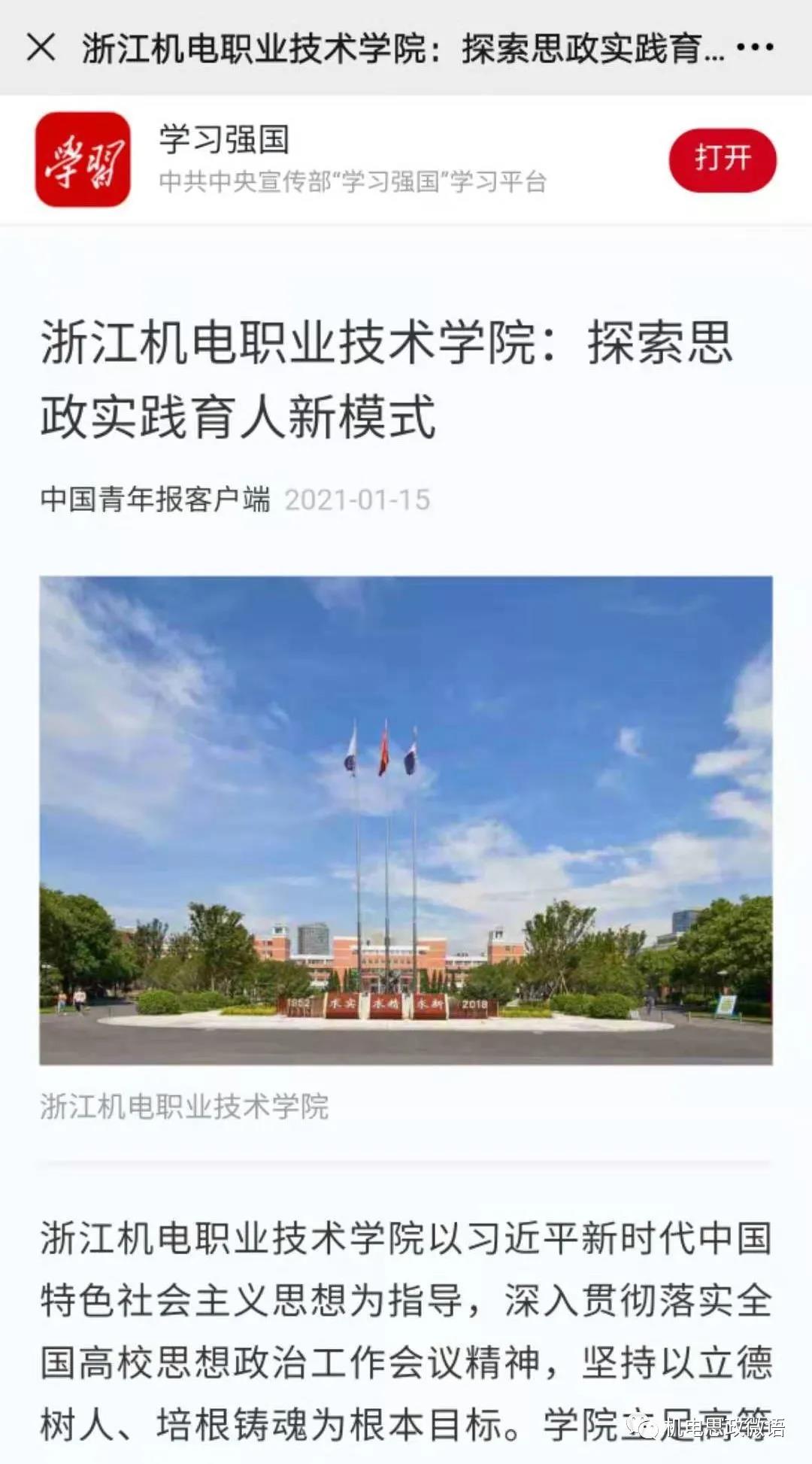 1月15日,中宣部“学习强国”学习平台刊发《浙江机电职业技术学院:探索思政实践育人新模式》一文,重点介绍了我院“一体两翼三化四平台”高职思政课实践教学新模式。