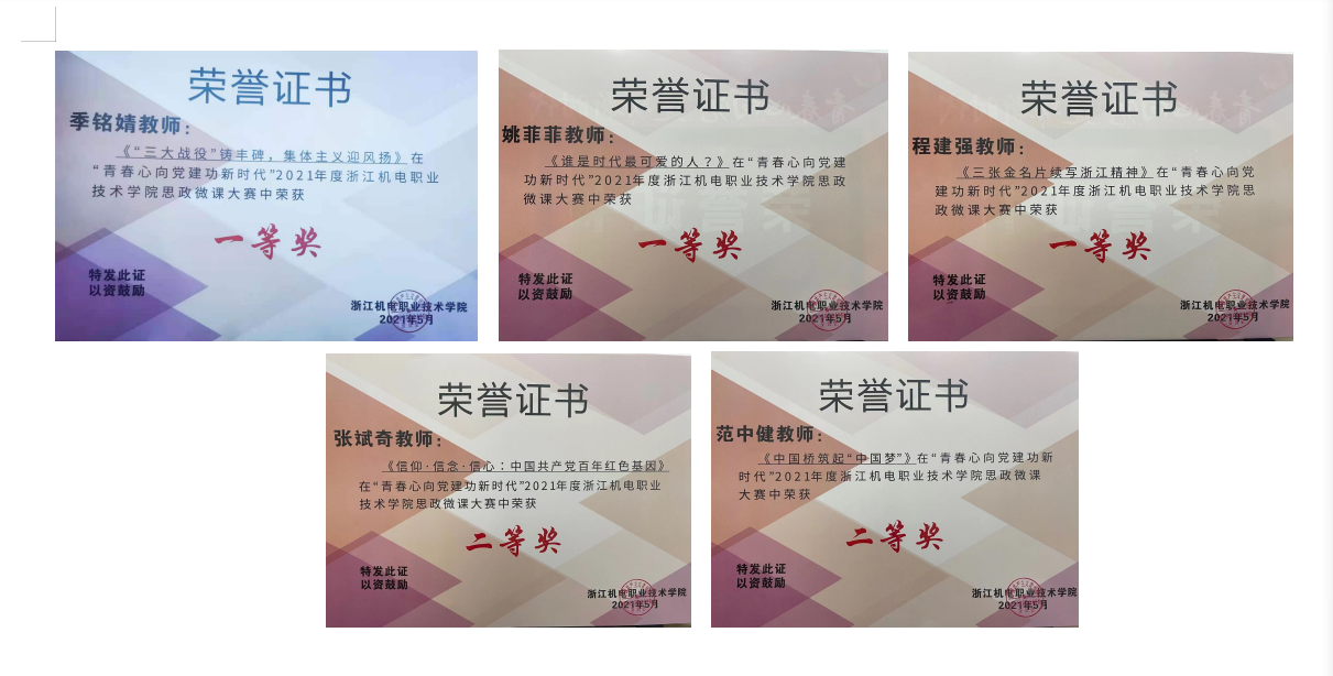 在由校团委主办的“青春心向党,建功新时代”2021年度思政微课大赛中,马克思主义学院教师凭借扎实的教学功底和富有感染力的讲述,斩获一等奖3个、二等奖2个,其中季铭婧老师思政微课作品在省赛中成功突围。