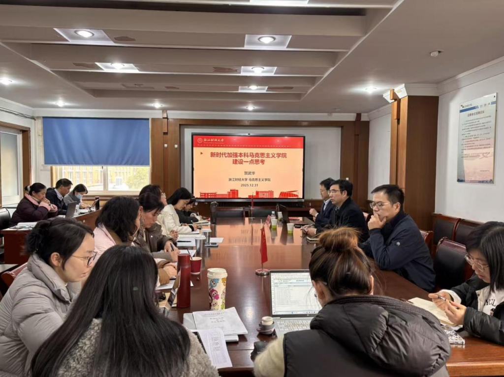 2025年12月31日下午,浙江财经大学马克思主义学院原院长、博士生导师贺武华教授应邀来我院作题为“新时代加强本科马克思主义学院建设的一点思考”的专题讲座。讲座由马克思主义学院院长查广云教授主持,学院全体思政课教师参加。