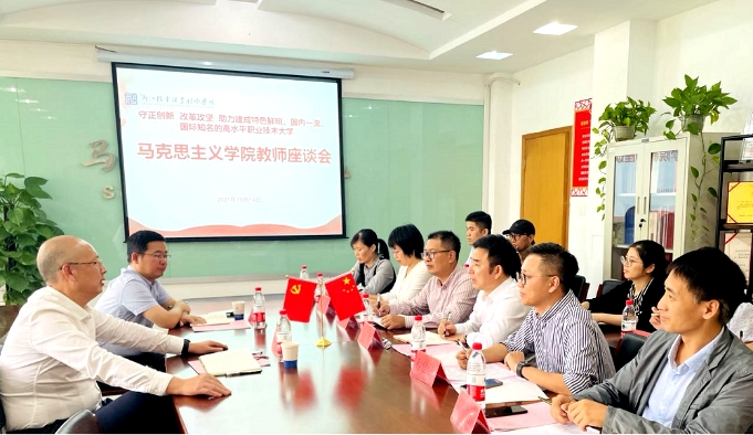 汤书记最后做了总结讲话。他对马克思主义学院发展取得的成绩给予充分肯定,对思政课教师团队的辛苦付出表示感谢,并提出了以下几点希望:一是要提高政治站位,强化责任意识,切实发挥思想政治理论课立德树人的主渠道主阵地作用;二是马院的同志站位要高、情怀要深,要体现主人翁精神,要深入推进二级学院管理现代化,提高治理效能,作为党委的分管部门,要发挥引领作用;三要快马加鞭、走在前列,对标对表“双高”建设工作要求,重点抓好“双高”项目,积极推进思政课实践教学基地建设,力争在高层次高水平教学科研项目上有进一步突破。汤书记要求,座谈会后要尽快把教师们提出的意见和建议梳理上报学院有关部门,学院相关职能部门要切实抓好落实,努力提升教师们的幸福感、获得感。