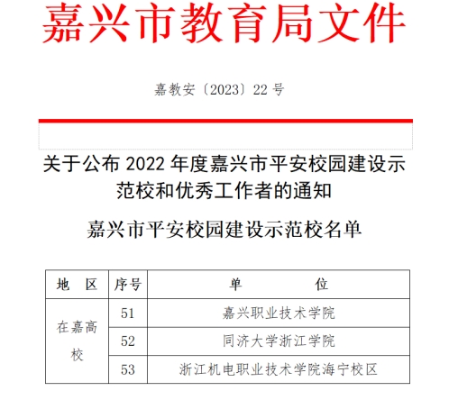 近日,嘉兴市教育局下发《关于公布2022年度嘉兴市平安校园建设示范校和优秀工作者的通知》,taptap点点海宁校区被授予“嘉兴市平安校园建设示范校”,共有3所高校获此荣誉。这是海宁校区继获嘉兴市征兵先进院校、嘉兴市反诈先进集体荣誉称号之后,在学校安全工作中获得的又一殊荣。