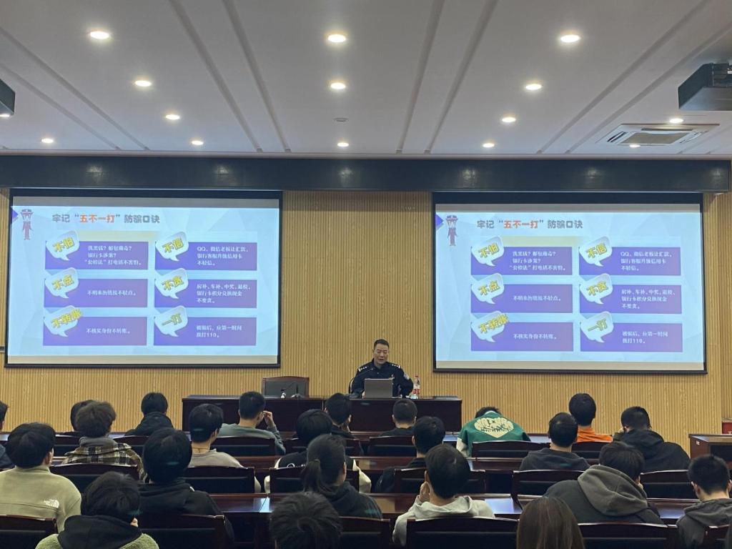 宣讲会上,陈教导员围绕如何预防犯罪、反恐防暴、交通安全、网络安全、消防安全、禁毒等十二项安全知识点开展教育活动,针对大学校园特点,用通俗易懂的讲课方式引导师生将安全知识入脑入心,提高学生们“知危险、会避险”的能力,强化提高同学们的安全防范意识。同时,针对近日频发的电信诈骗案件,陈教导员以真实案例切入讲解了电信诈骗常见套路,向师生强调反电信诈骗“五不一打”口诀。