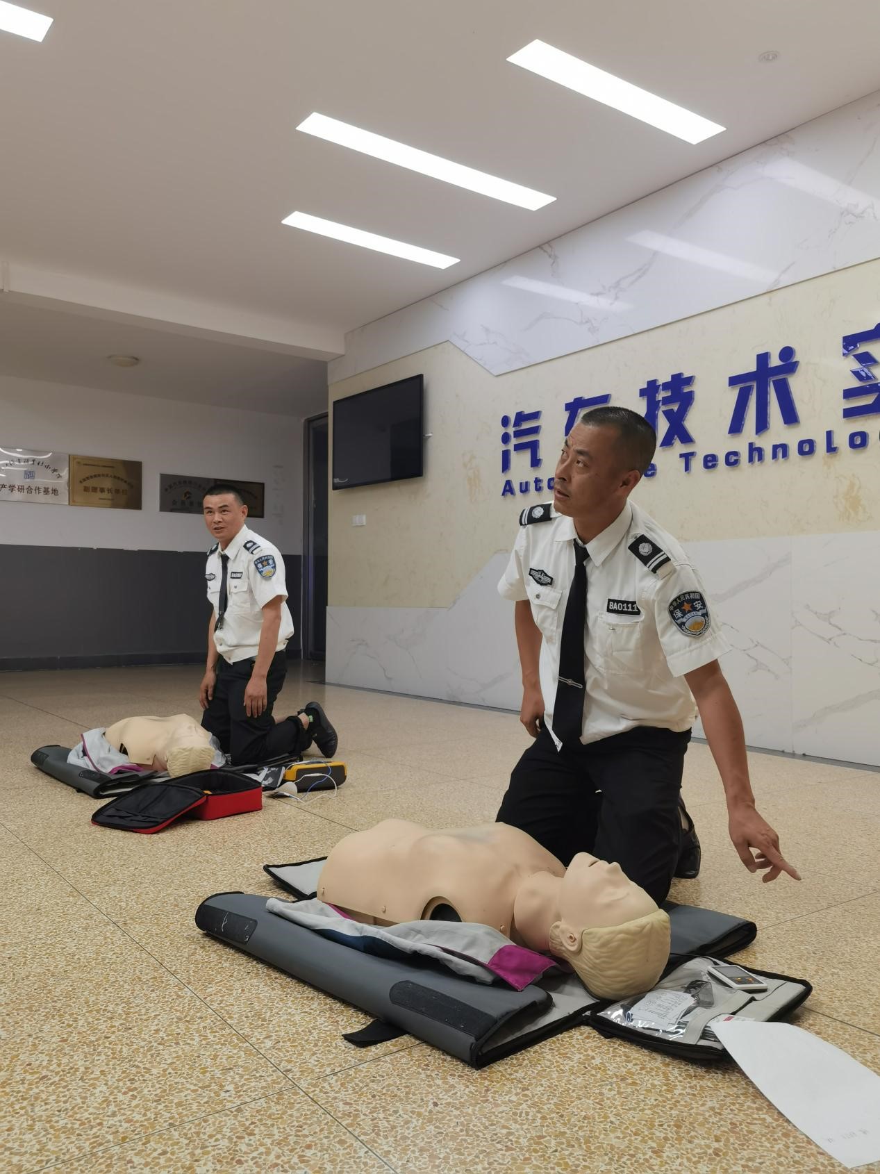 杭州红十字会讲师叶老师、海宁中心医院护士长分别对两校区校卫队员从背景知识讲述、心肺复苏(CPR)图片演示和公共体外除颤仪(AED)的介绍等方面进行,特别强调了及时除颤的必要性及注意事项,让大家深刻认识到对心脏骤停人员及时进行心脏复苏并使用AED除颤的重要性。生动的教学案例、朴实的解读语言和真实的实操体验,确保每个安保人员能学易懂、学有所获,为后期遇到突发状况能够冷静科学处置打下基础。