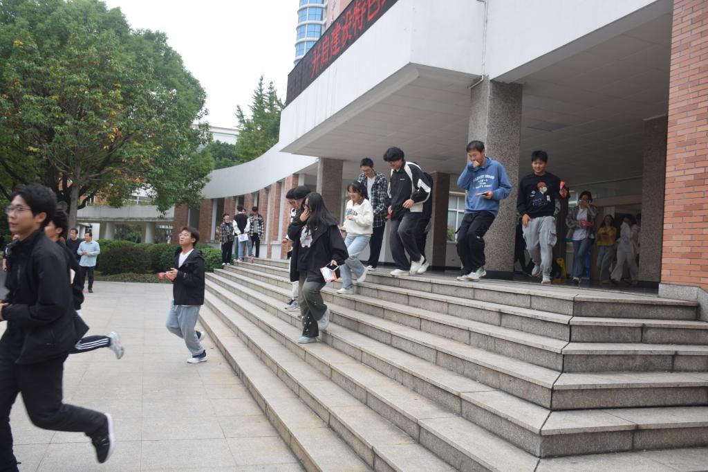 首先开展消防疏散演习。随着烟气逐渐弥漫,警报声响彻两校区,两校区教学楼及海宁校区图书馆、宿舍的师生们迅速响应,在学校安保人员的疏散引导下,捂住口鼻,弓身沿着疏散指示通道紧急撤离到指定场地。医疗救援、消防人员、校安保人员快速反应,组织灭火救援,疏散演练工作顺利完成。期间穿插人员晕倒应急演练,演练过程中各组分工明确,行动迅速,配合默契,处置得当,整个演练过程达到了预期的效果。