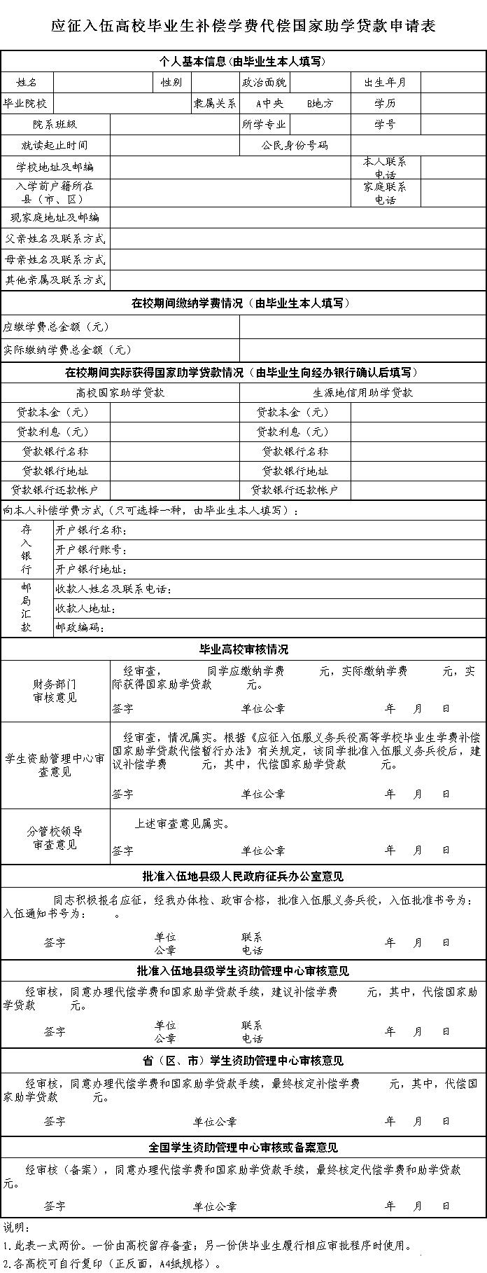 入伍毕业生学费补偿代偿申请表