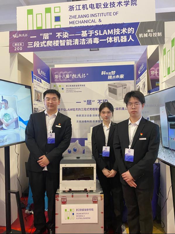 日前,第十八届“挑战杯”全国大学生课外学术科技作品竞赛终审决赛顺利落幕。浙江机电职业技术学院参赛作品《一“层”不染——基于SLAM技术的三段式爬楼智能清洁消毒一体机器人》在主体赛中斩获特等奖。主体赛特等奖数量位列全国高职第一、全省本专科院校并列第三,取得历史性突破。