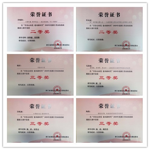 近日,由共青团浙江省委、浙江省教育厅、浙江省学生联合会主办的2020年度浙江省高校思政微课大赛获奖名单公布,taptap点点创意设计学院茅晓阳同学的《心有灯盏向阳而生——我们的战疫“不一YOUNG”》和马克思主义学院张永丽老师的《“疫”战青春无悔人生——从疫情看大学生如何树立正确的人生观》从全省80所本科和高职院校选送的544件思政微课作品中脱颖而出,分别荣获学生组和教师组二等奖;毛倩雨同学的《有思想、有筋骨、有自信——在校园文艺创作中绽放文化自信》、吴屹涵同学的《以青春之我建功新时代》、陶然同学的《退役大学生筑造高校思政教育的桥梁》、姚婷老师的《青春的力量》等四件思政微课分别获学生组和教师组三等奖。