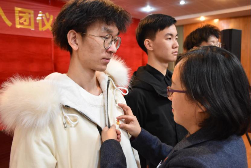 在嘹亮的团歌声中,入团仪式正式开始,校团委谢雯老师宣读新团员名单。校团委书记为新团员代表佩戴团徽。50名新团员面对鲜艳的团旗进行了庄严的宣誓。