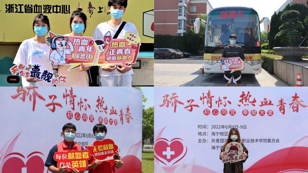 为弘扬“奉献、友爱、互助、进步”的志愿服务精神,为救死扶伤、无私奉献的无偿献血公益事业贡献力量,6月8日至9日,校团委与浙江省血液中心、海宁市中心血站进行联动,在两校区同时举办了“骄子情怀、热血青春”的公益献血活动。广大青年学生踊跃报名,用行动支持无偿献血公益事业。