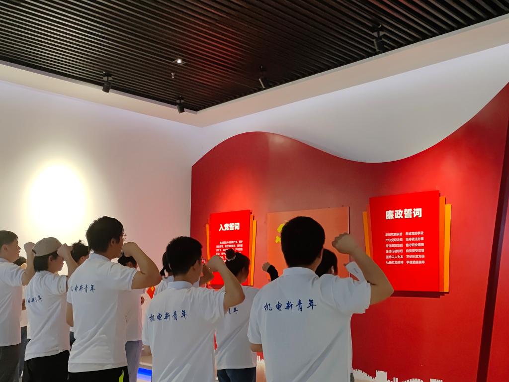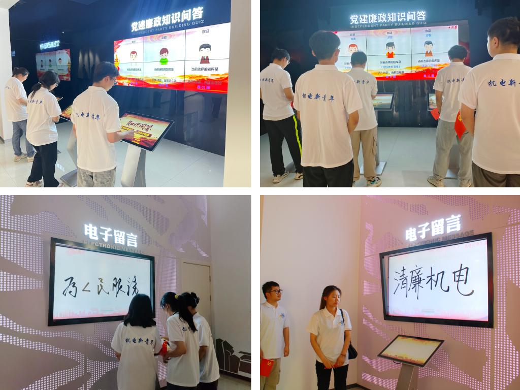 廉洁教育深入心。在活动的最后,机电新青年们学习了入党誓词以及廉洁誓词,并且在党旗下郑重宣誓,牢记于心。新颖的“党建廉政知识问答”区域引得机电新青年们驻足参与,在快速问答的氛围里,让清廉理念入耳、入脑、入心、入行。为了传递廉洁之风,推广廉洁文化,机电新青年们在电子留言区下留言,把清廉文化、奉献文化、守纪文化、礼仪文化等融入日常。