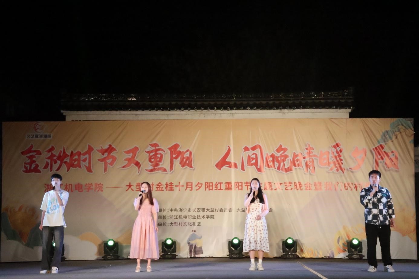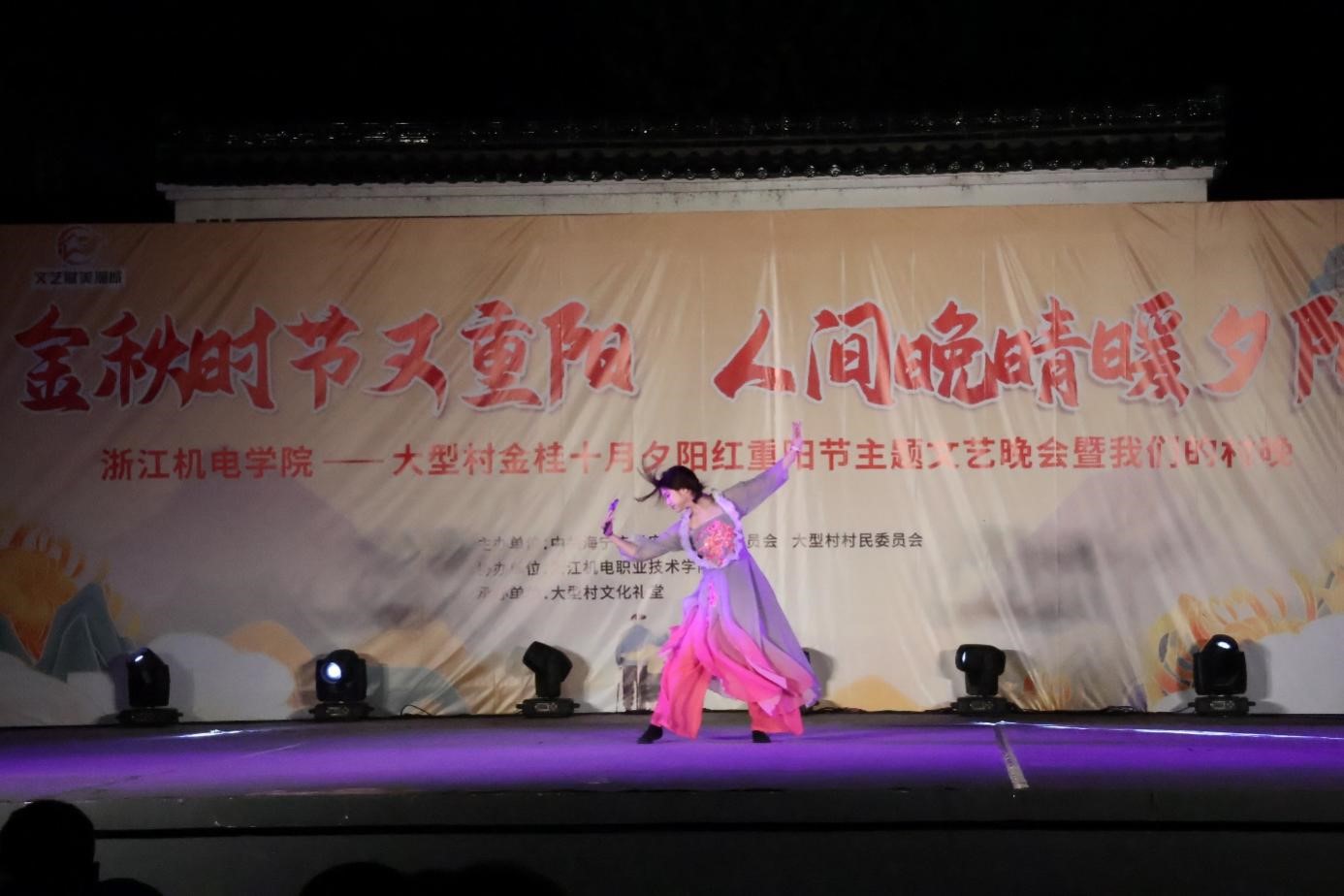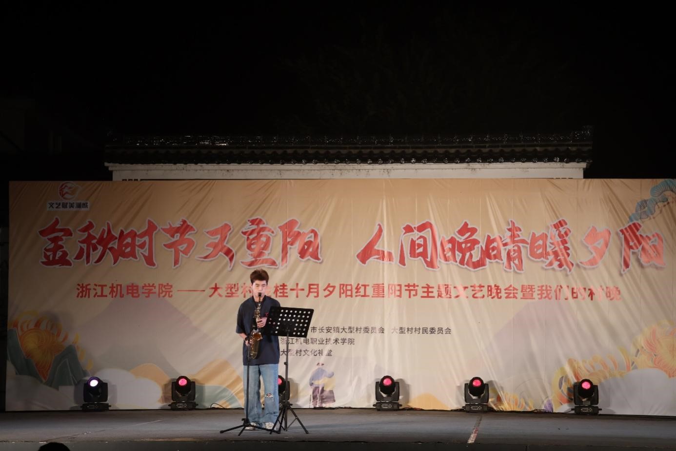 10月22日,校团委组织大学生艺术团、流行音乐协会、天幕吉他社等学生社团在长安镇大型村文化礼堂开展“金秋时节又重阳、人间晚晴暖夕阳”重阳节主题文艺演出。演出在热烈欢快的合唱《在希望的田野上》中拉开序幕,期间表演既有老一辈耳熟能详的《女儿情》、《东方红》《我和我的祖国》、《老男孩》……又有年轻一辈热爱的《点绛唇》、《兰亭序》……等曲目,现场观众或鼓掌叫好或拍照留念,记录美好瞬间。晚会在传承优良家风家训的余年钊和陈鑫州家庭代表上台时推向高潮,在时下最激扬的杭州亚运主题曲《等你来》中落下帷幕。