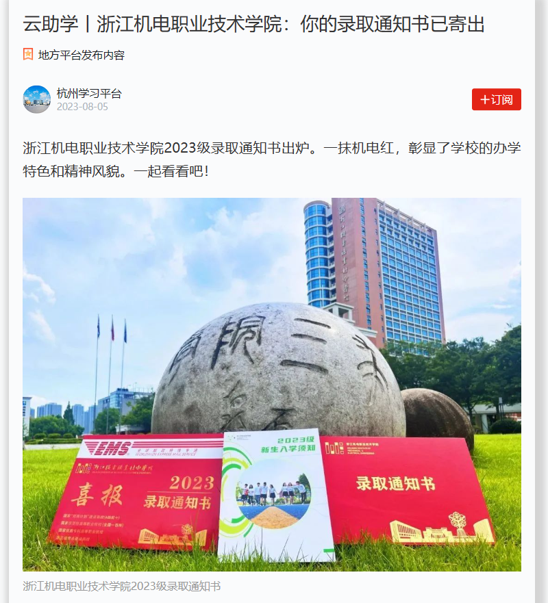 [学习强国 杭州学习平台]云助学丨浙江机电职业技术学院:你的录取通知书已寄出