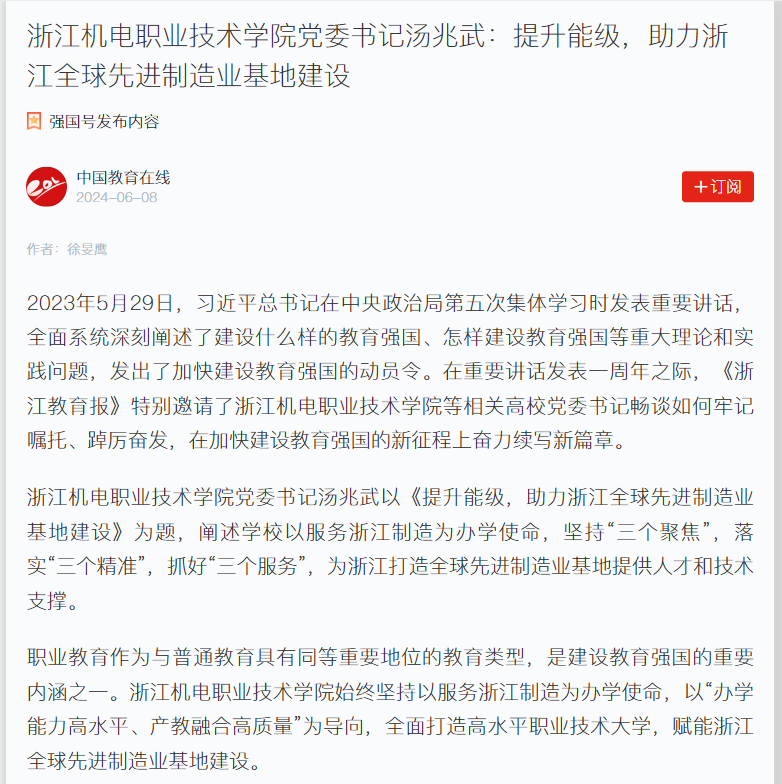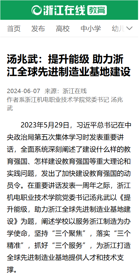 2023年5月29日,习近平总书记在中央政治局第五次集体学习时发表重要讲话,全面系统深刻阐述了建设什么样的教育强国、怎样建设教育强国等重大理论和实践问题,发出了加快建设教育强国的动员令。在重要讲话发表一周年之际,《浙江教育报》特别邀请了浙江机电职业技术学院等相关高校党委书记畅谈如何牢记嘱托、踔厉奋发,在加快建设教育强国的新征程上奋力续写新篇章。浙江机电职业技术学院党委书记汤兆武以《提升能级,助力浙江全...