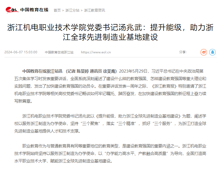 [中国教育在线]浙江机电职业技术学院党委书记汤兆武:提升能级,助力浙江全球先进制造业基地建设