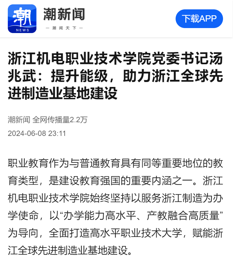 [潮新闻]浙江机电职业技术学院党委书记汤兆武:提升能级,助力浙江全球先进制造业基地建设
