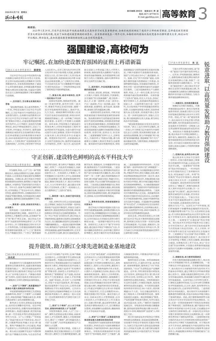 中国教育在线浙江站讯 (记者 陈显婷 通讯员 徐旻鹰)2023年5月29日,习近平总书记在中央政治局第五次集体学习时发表重要讲话,全面系统深刻阐述了建设什么样的教育强国、怎样建设教育强国等重大理论和实践问题,发出了加快建设教育强国的动员令。在重要讲话发表一周年之际,《浙江教育报》特别邀请了浙江机电职业技术学院等相关高校党委书记畅谈如何牢记嘱托、踔厉奋发,在加快建设教育强国的新征程上奋力续写新篇章。浙江机电...