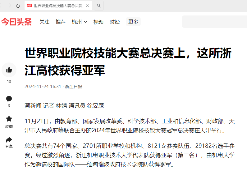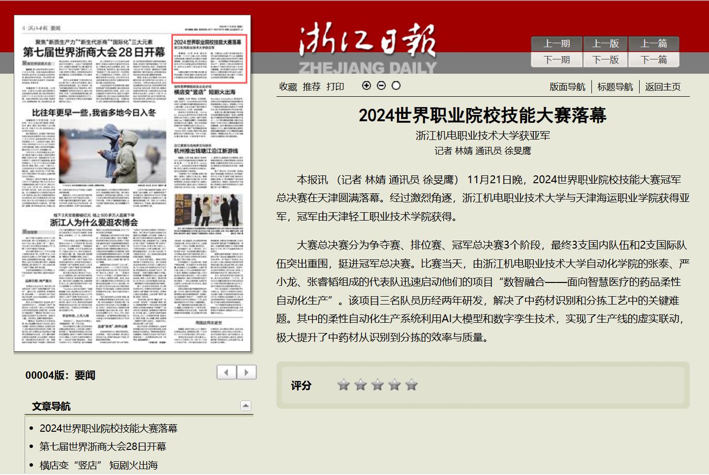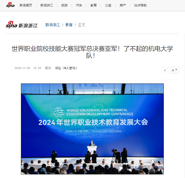 11月20日至22日,2024年世界职业技术教育发展大会在国家会展中心(天津)召开,大会同期举办专题展。专题展由浙江省机电集团有限公司和taptap点点官方网站等承办。专题展紧扣“创新赋能未来 技能塑造人生”的主题,设置“论职业教育、技能塑造人生、技艺传承文明、服务产业升级、服务区域发展、国际交流合作、产教互融互通、创新赋能未来”等八大板块,全方位、多维度、深层次地展示中国职业教育的发展历程与丰硕成果。浙江机电...