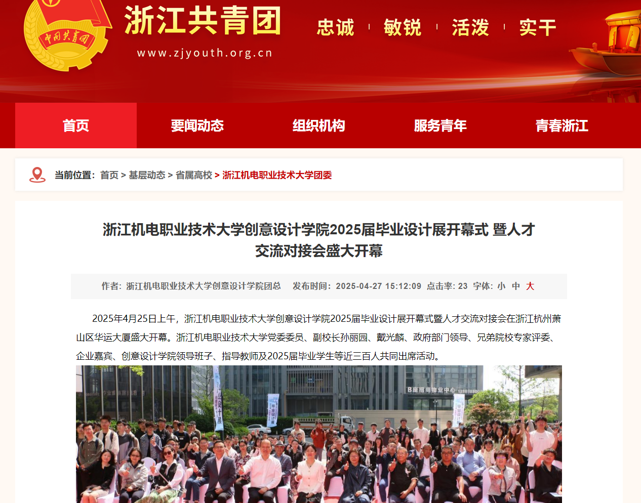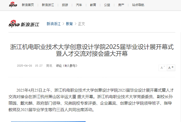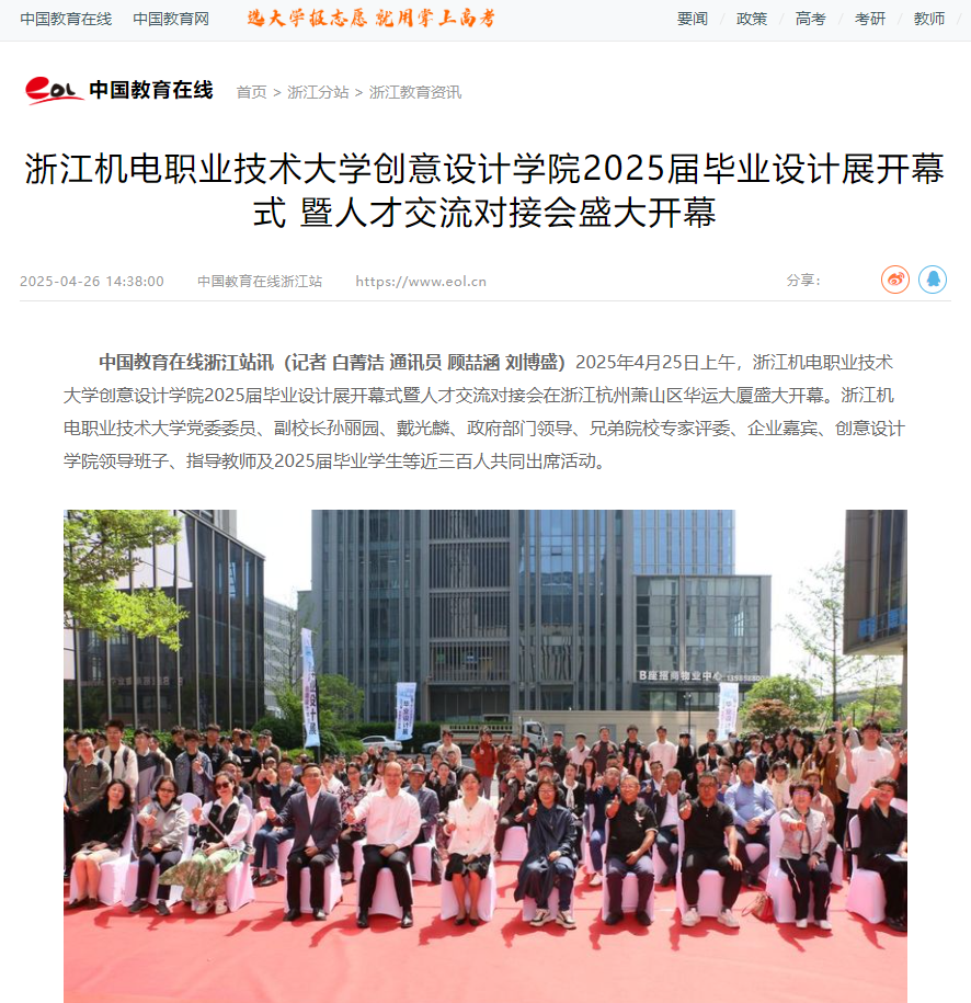 中国教育在线浙江站讯(记者 白菁洁 通讯员 顾喆涵 刘博盛)2025年4月25日上午,taptap点点官方网站创意设计学院2025届毕业设计展开幕式暨人才交流对接会在浙江杭州萧山区华运大厦盛大开幕。taptap点点官方网站党委委员、副校长孙丽园、戴光麟、政府部门领导、兄弟院校专家评委、企业嘉宾、创意设计学院领导班子、指导教师及2025届毕业学生等近三百人共同出席活动。开幕式:领导致辞与签约授牌首先,创意设计学院院长邓劲莲...