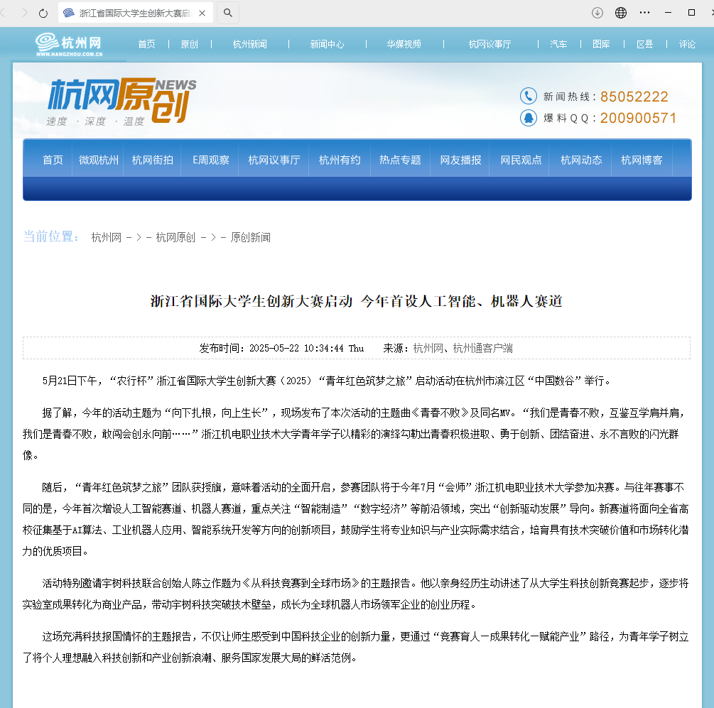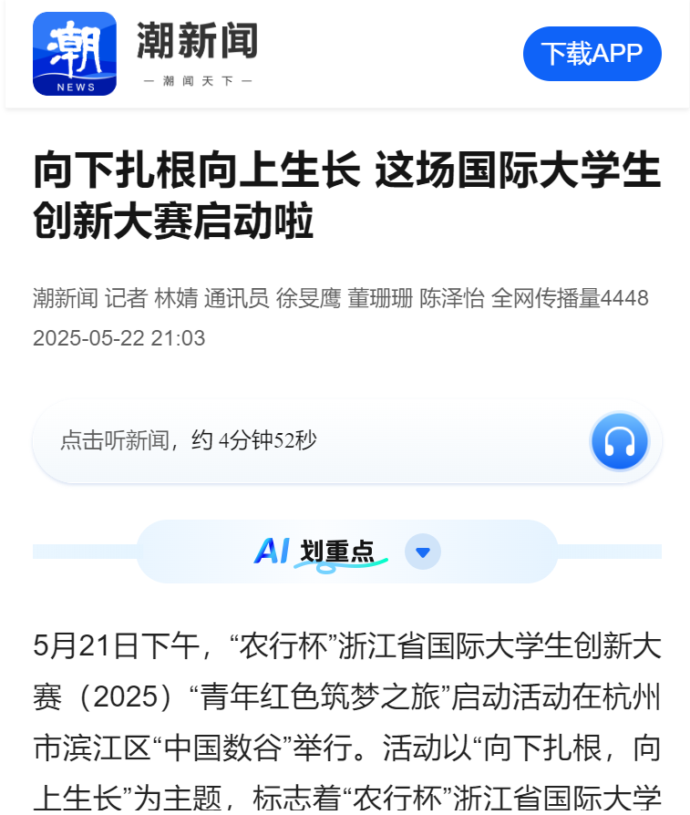 为深入贯彻落实习近平总书记给中国国际大学生创新大赛参赛学生代表的重要回信和给大赛“青年红色筑梦之旅”大学生重要回信精神,引导青年学子扎根中国大地,在传承红色基因中筑牢信仰根基,在服务国家战略中贡献青春力量,用创新创业的生动实践奋力谱写中国式现代化浙江新篇,5月21日下午,“农行杯”浙江省国际大学生创新大赛(2025)“青年红色筑梦之旅”启动活动在杭州市滨江区“中国数谷”举行。活动由浙江省教育厅、共青团...