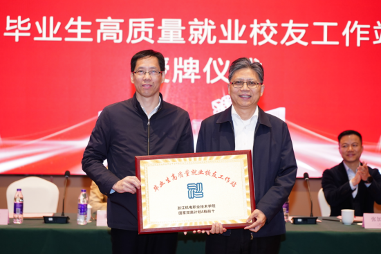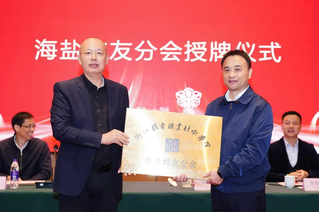 会上,汤兆武、周纯江、项建斌分别为海盐校友分会、毕业生高质量就业校友工作站、产教合作海盐工作站授牌。