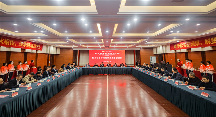 2022年11月19日下午两点,2022年校友会第十四届常务理事会会议在海宁校区圆方楼一楼报告厅召开。来自省内各地校友分会的会长、秘书长和学校领导、地方政府领导及各学院党总支书记等50余人齐聚海宁校区,共忆七秩岁月,同话今朝传承