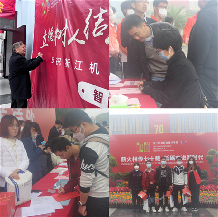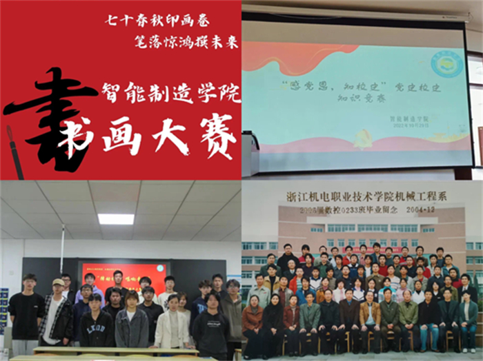 为庆祝建校70周年,在学校党委的统一部署下,智能制造学院开展了一系列纪念活动:“七十春秋印画卷,笔落惊鸿撰未来”书画大赛、“我的机电故事”征文大赛优秀作品展示、“那年的机电与我”照片展、镜头里的机电——智能制造学院摄影比赛、 饮水思源 情系母校——母校七十华诞,智能制造学院校友献祝福等系列活动,展现智能制造学院“崇德瀹智、笃行至善”的院风,践行浙江机电职业技术学院“求实、求新、求精”的校训