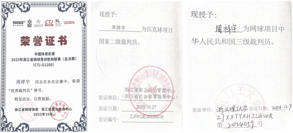 在张翔老师的悉心指导下,周祥宇的执裁之路稳步前行。2024年,他成功考取网球项目三级裁判员证书,并在张老师推荐下参与省级青少年网球赛事,积累了宝贵的实战经验。随后,张老师进一步发掘其在匹克球项目上的执裁优势,针对性开展国家二级裁判员考核备战指导,助力他于2025年10月顺利斩获匹克球项目国家二级裁判员资格。在2025年浙江省青少年网球巡回赛(湖州站)中,周祥宇凭借规范专业的执裁表现与沉稳从容的临场发挥,荣获“优秀裁判员”称号,为此次征战国际赛场奠定了坚实基础。