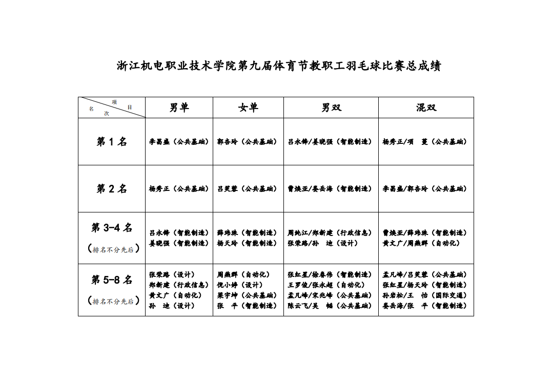 浙江机电职业技术学院第九届体育节教职工羽毛球比赛总成绩