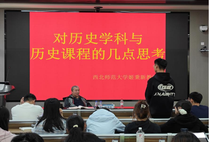 姬秉新教授首先针对历史教师的培养目标,指出历史教育硕士的目标不能仅仅是培养合格的中学历史教师,而是优秀教师。他深刻阐明历史教育与历史研究之间的区别,强调一定要重视历史教育的纪律、边界,必须明晰当前中学历史课程的特色。接着姬秉新教授结合其求学经历和工作体会,从中学历史教学的特点、中学历史课堂教学的基本方法和中学生学习历史的基本要求等三方面进行了梳理和分析。在区分学科知识体系和学习知识体系的基础上,姬秉新教授特别强调中学历史教学中要注重“讲”,讲授历史是传递历史知识最准确、最经济、最有效的方法和手段。在讲授的过程中,多真实、具体的历史细节,少抽象的历史概念定义;多历史情境与过程的生动形象展现,少干瘪无力的说教引导,多图文并茂的科学解读,少随意引申的主观臆断。讲座最后,姬秉新教授还与到场同学就中学历史课程编排、中学历史教学方法运用等问题展开了热烈的互动讨论。
